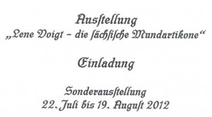 Am 22. Juli 2012 wurde bei strahlendem Sonnenschein, Gaffee und Guchen die Lene -Voigt-Ausstellung im Museum in den Alten Pfarrhäusern in Mittweida eröffnet. Edelgard Langer stimmte die zahlreich erschienenen Besucher mit Lene-Voigt-Gedichten aus dem Gaffeeglatsch-Programm der „Fiff´chen Gaffeesachsen“ ein. Die sehenswerte umfangreiche Ausstellung wurde von der Mittweidaer Lene-Voigt-Verehrerin Sigrid Kaminsky organisiert und eigenhändig liebevoll gestaltet. Die Lene-Voigt-Gesellschaft unterstützte das Projekt mit der Leihgabe zahlreicher Materialien aus unserem Archiv.