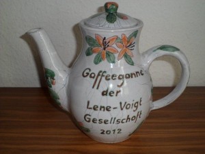 Am 23. Oktober 2012 lädt die Lene-Voigt-Gesellschaft e.V. zum 15. Mal zu ihrem heiteren Vortragswettbewerb um die „Gaffeeganne“ ein. Wer hat Mut, je einen mundartliches und ein hochdeutsches Gedicht oder einen kleinen Prosatext von Lene Voigt auf der Bühne des Kabaretts SANFTWUT vorzutragen? Der oder die Beste darf die begehrte Trophäe, die eigens dafür in einer Gohliser Keramikwerkstatt gefertigte Gaffeeganne, heeme schläbben.